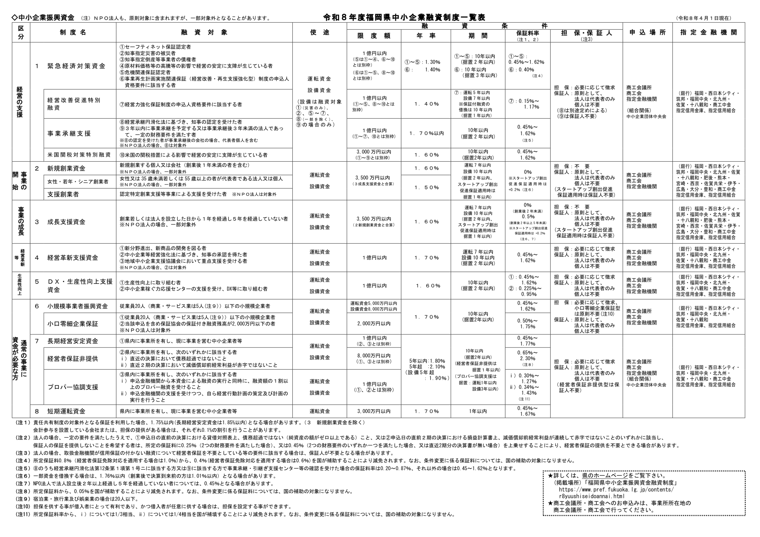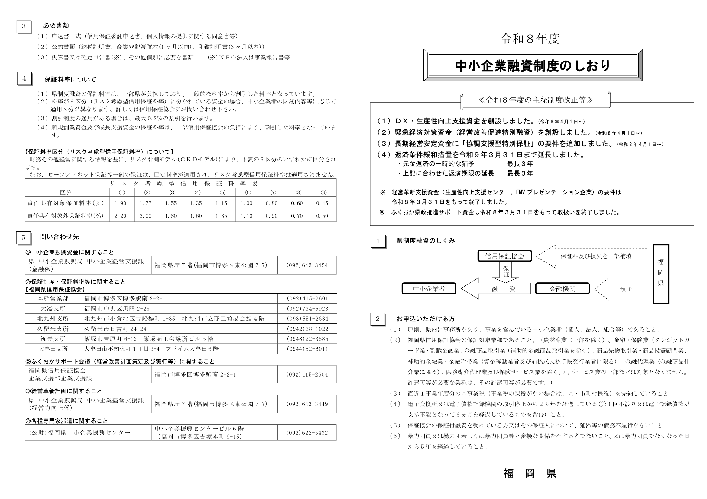 福岡県では、中小企業の皆さまを支える融資制度を実施しています。申込には申込書類、公的書類、決算書等が必要です。保証料は「一部県が負担しており、一般的な料率から割引した料率となっています。」